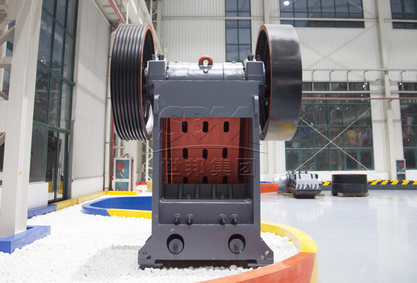 本產(chǎn)品以電動機為動力,通過電動機皮帶輪,由三角皮帶和槽輪驅(qū)動偏心軸,使動顎按預定軌跡作往復運動,將進入由固定顎板、活動顎板和邊護板組成的破碎腔內(nèi)的物料破碎,并通過下部的排料口將成品物料排出。