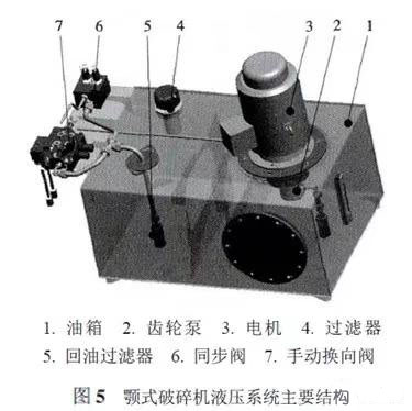 新款顎式破碎機(jī)通常使用液壓系統(tǒng)來輔助調(diào)整破碎機(jī)排料口大小,方便快捷,其液壓系統(tǒng)主要結(jié)構(gòu)如圖5所示。
