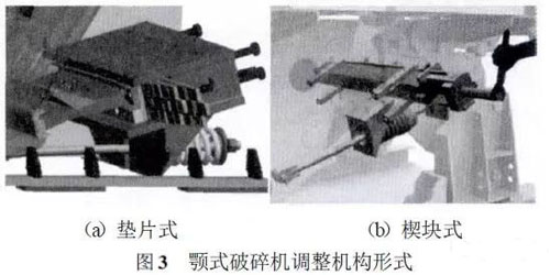 顎式破碎機(jī)調(diào)整機(jī)構(gòu)如圖3所示,目前調(diào)整機(jī)構(gòu)形式主要分為墊片式和楔塊式兩種結(jié)構(gòu)。