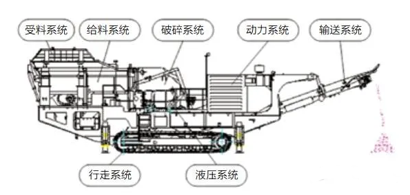 履帶式移動(dòng)破碎站由受料系統(tǒng)、給料系統(tǒng)、破碎系統(tǒng)、動(dòng)力系統(tǒng)、輸送系統(tǒng)、行走系統(tǒng)、液壓系統(tǒng)等組成,如圖所示。其中動(dòng)力系統(tǒng)是履帶式移動(dòng)破碎站的“心臟”,本文分享幾種常見(jiàn)驅(qū)動(dòng)方式。