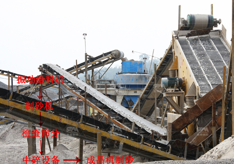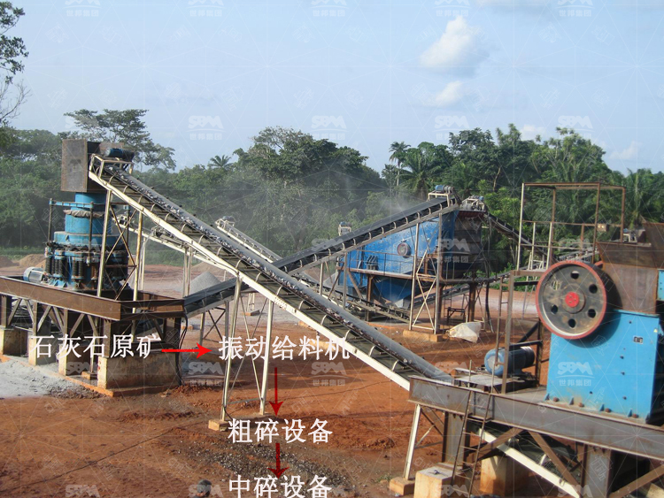主要的石灰石加工設(shè)備為顎破機、反擊破、制砂機以及洗砂機,然后輔助的設(shè)備為給料機、振動篩、輸送機等。