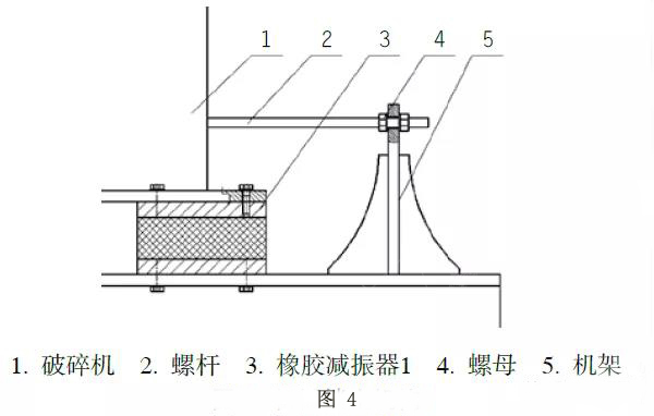 由于橡膠與鋼板膠合力較小,因此這種減振器只允許承受軸向壓力和較小的徑向剪切力。破碎機(jī)工作時(shí)會(huì)產(chǎn)生較大的沖擊和振動(dòng),因此破碎機(jī)一般選用皮帶傳動(dòng),用于緩沖和吸能。為了保證傳動(dòng)皮帶具有足夠的預(yù)緊力、防止皮帶脫軌飛出,并避免減振器因徑向過載損壞,需要限制減振器徑向位移,所以需要在破碎機(jī)傳動(dòng)皮帶預(yù)緊力方向上增加機(jī)械鎖止機(jī)構(gòu)(如圖4所示),用螺桿限制破碎機(jī)在此方向上的位移量。