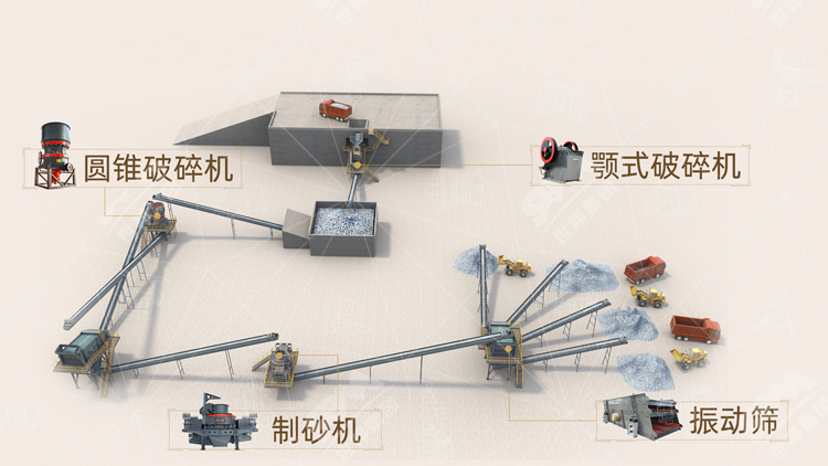 石料先由粗碎機(jī)進(jìn)行初步破碎,一般選用顎式破碎機(jī),破碎后的粗料由皮帶輸送機(jī)輸送到反擊式破碎機(jī)或圓錐破碎機(jī)進(jìn)行細(xì)碎,二級(jí)破碎設(shè)備要根據(jù)物料的性質(zhì)選擇設(shè)備,中等硬度的物料選用反擊式破碎機(jī),高硬度物料選用圓錐破碎機(jī),細(xì)碎后的石子進(jìn)入制砂設(shè)備處理,對(duì)于不符合粒度的物料返回進(jìn)行再次細(xì)碎,對(duì)于符合物料的石子進(jìn)入制砂機(jī)制砂,經(jīng)制砂后的成品砂清洗后不符合要求的再次破碎,直到符合要求為止。