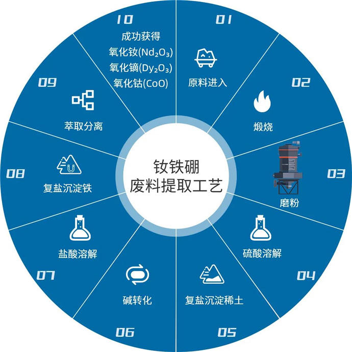釹鐵硼主要成分為稀土元素釹(Nd)、鐵(Fe)、硼(B),其中稀土元素主要為釹(Nd)。釹鐵硼磁性材料在生產(chǎn)過程中容易產(chǎn)生大量的廢料,為了節(jié)約資源,避免稀土資源的浪費(fèi)和工業(yè)污染,對釹鐵硼廢料的處理顯得至關(guān)重要。
