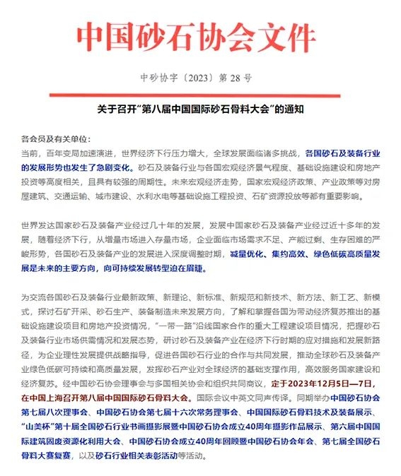 2023年12月5日-7日,由中國砂石協(xié)會主辦,世邦工業(yè)·黎明重工承辦的“第八屆中國國際砂石骨料大會”將于上海市浦東新區(qū)召開。
