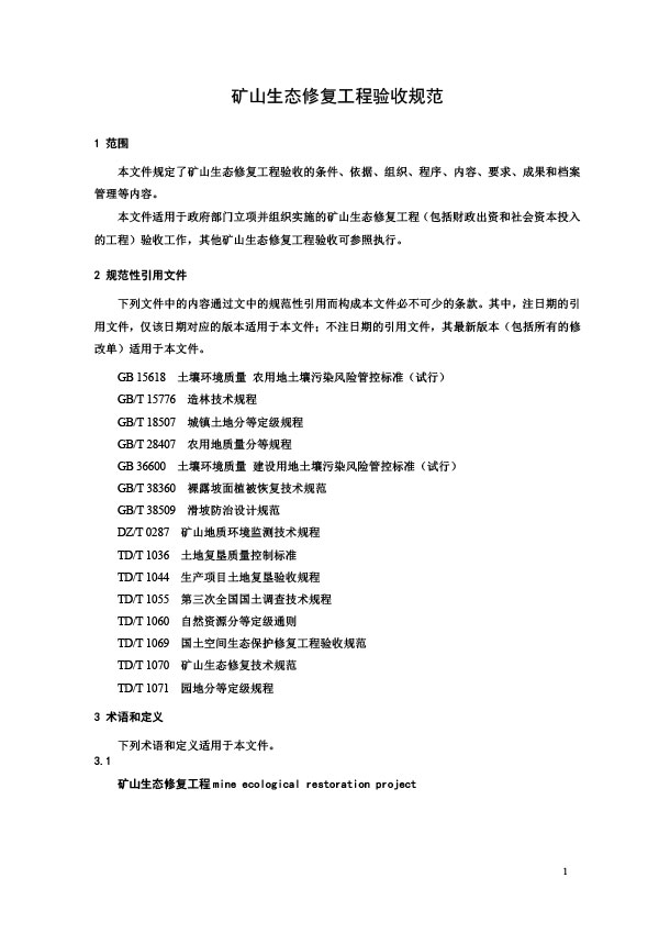 本文件規(guī)定了礦山生態(tài)修復工程驗收的條件、依據(jù)、組織、程序、內(nèi)容、要求、成果和檔案管理等內(nèi)容。本文件適用于政府部門立項并組織實施的礦山生態(tài)修復工程(包括財政出資和社會資本投入的工程)驗收工作,其他礦山生態(tài)修復工程驗收可參照執(zhí)行。