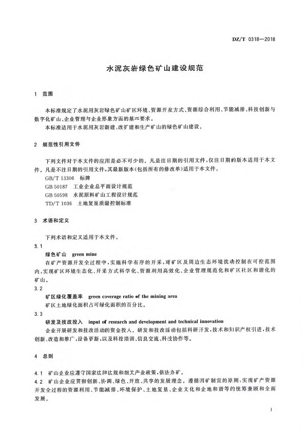 本標(biāo)準(zhǔn)規(guī)定了水泥用灰?guī)r綠色礦山礦區(qū)環(huán)境,資源開發(fā)方式、資源綜合利用、節(jié)能誠排、科技創(chuàng)新與數(shù)字化礦山、企業(yè)管理與企業(yè)形象方面的基本要求。本標(biāo)準(zhǔn)適用于水泥用灰?guī)r新建、改擴(kuò)建和生產(chǎn)礦山的綠色礦山建設(shè)。