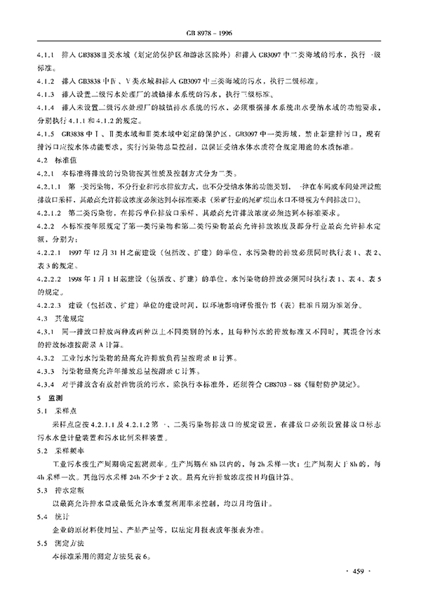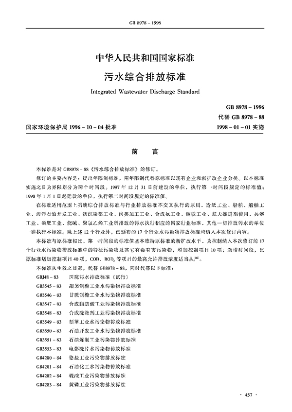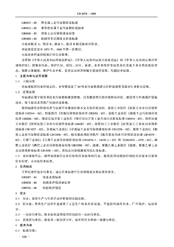 本標準按照污水排放去向,分年限規(guī)定了69種水污染物理想允許排放濃度及部分行業(yè)理想允許排水量。本標準適用于現有單位水污染物的排放管理,以及建設項目的環(huán)境影響評價、建設項目環(huán)境保護設施設計、竣工驗收及其投產后的排放管理。