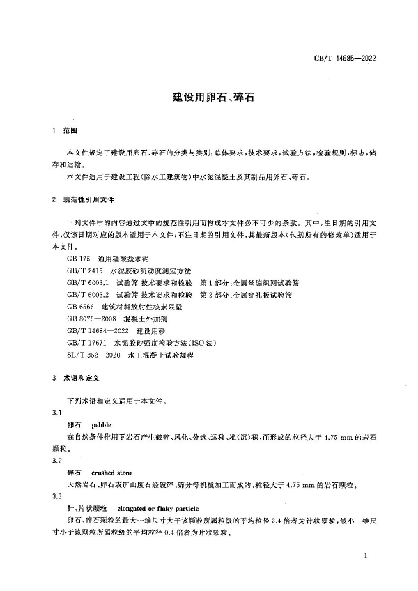 建筑用石料的生產(chǎn)不僅會影響自然環(huán)境,還影響工程建設(shè)質(zhì)量。隨著工程建筑對石料的消耗不斷增加,石料的來源趨于復(fù)雜,同時隨著工程技術(shù)的進(jìn)步,對混凝土質(zhì)量要求提高,對石料的質(zhì)量要求也不斷提高。本標(biāo)準(zhǔn)適用于建設(shè)工程中水泥混凝土及其制品用卵石、碎石。